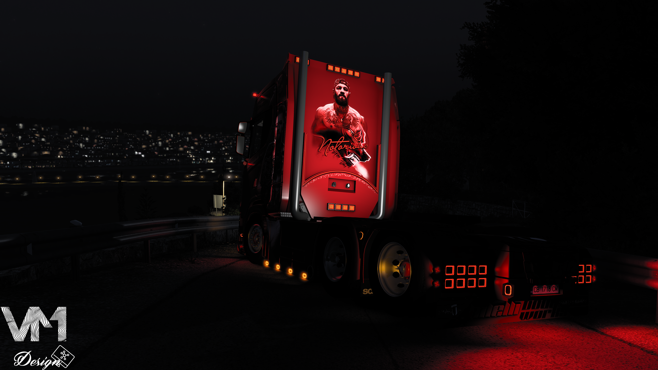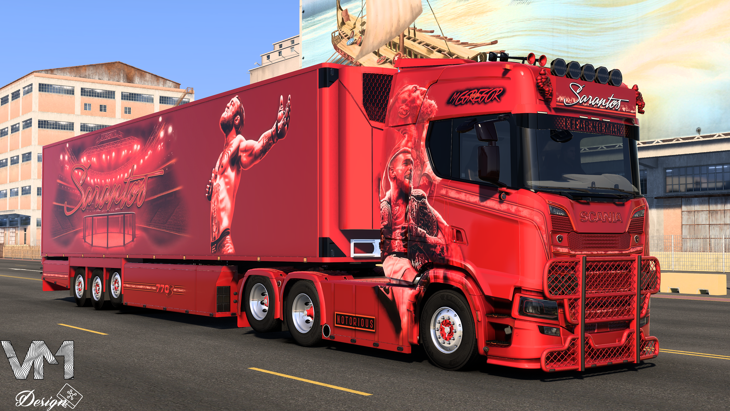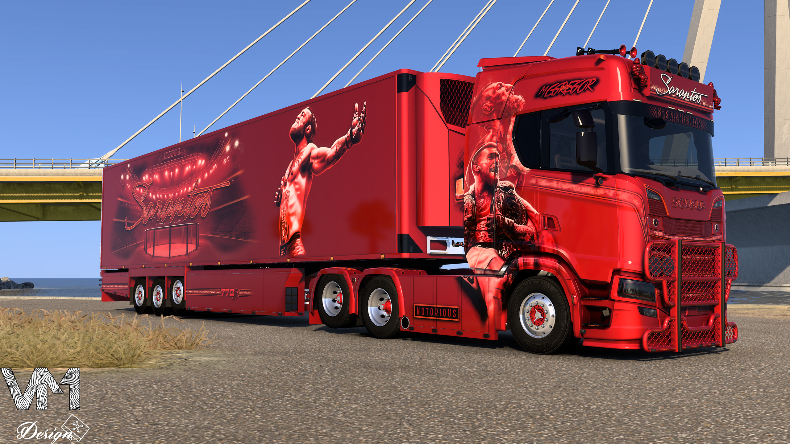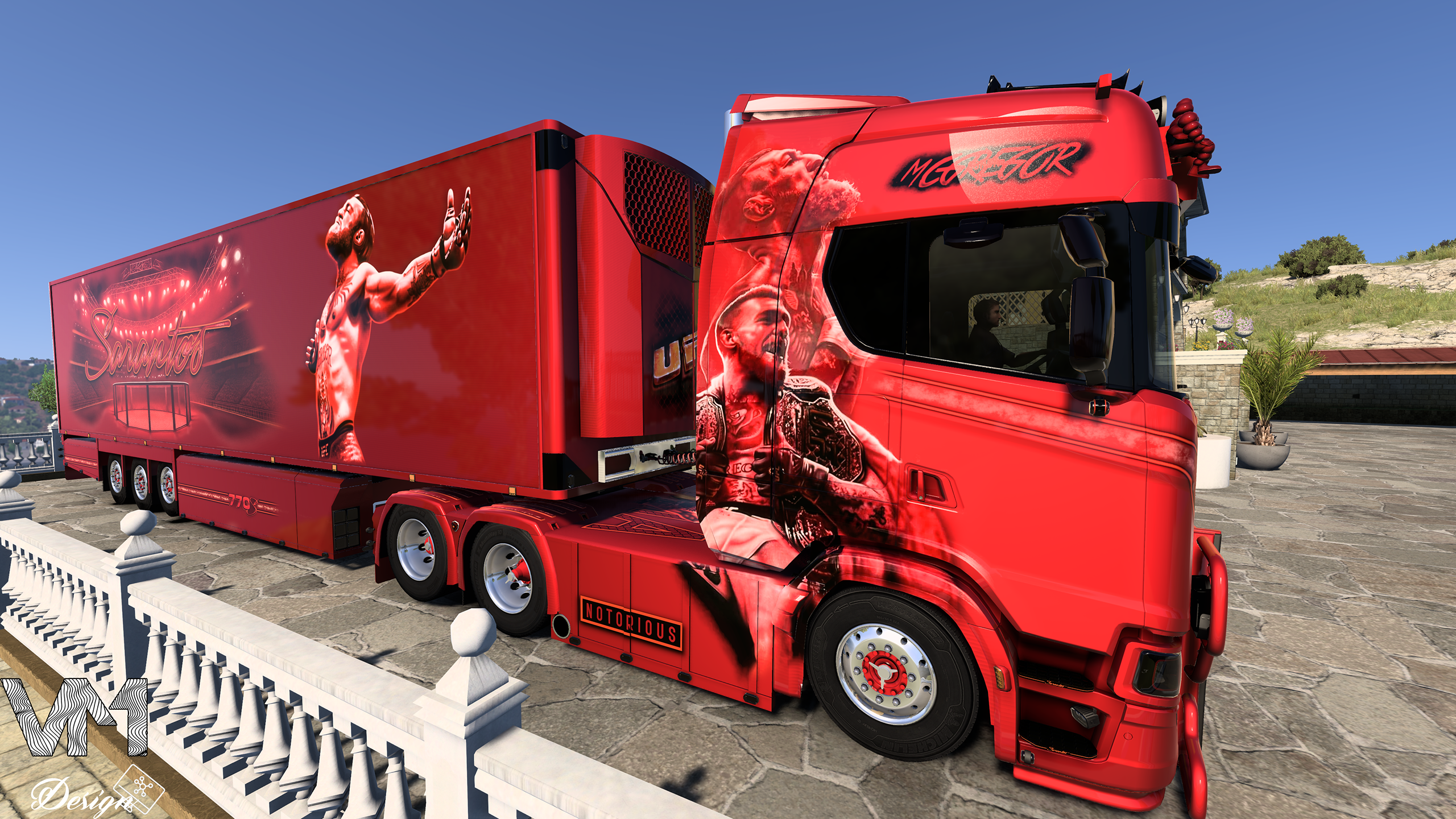 This is a complete Truck and Trailer combo of the Scania “Conor McGregor” by Sarantos. This project was made from scratch, all the details, lighting accessories were made to match the real truck as best as possible. We tried to represent the real Conor McGregor Combo to almost the 100% of it’s details.